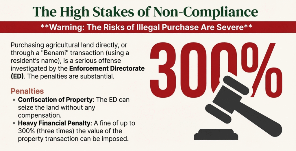 A: Purchasing agricultural land without special RBI permission is a serious offense under FEMA. This can result in a heavy penalty, which could be up to three times the price of the agricultural land purchased, and the property itself can be confiscated. The Enforcement Directorate (ED) is the authority responsible for investigating such offenses.