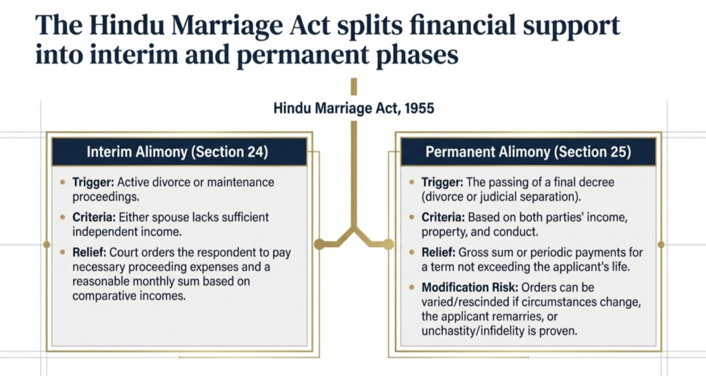 Interim Alimony- under Section 24 of The Hindu Marriage Act: It allows interim alimony during the divorce process. Interim alimony means temporary financial support that a court orders until the final decision on the divorce petition or maintenance case is made.