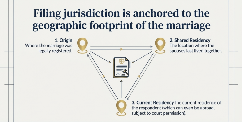 -The wife is currently residing (in certain cases), or The respondent resides.