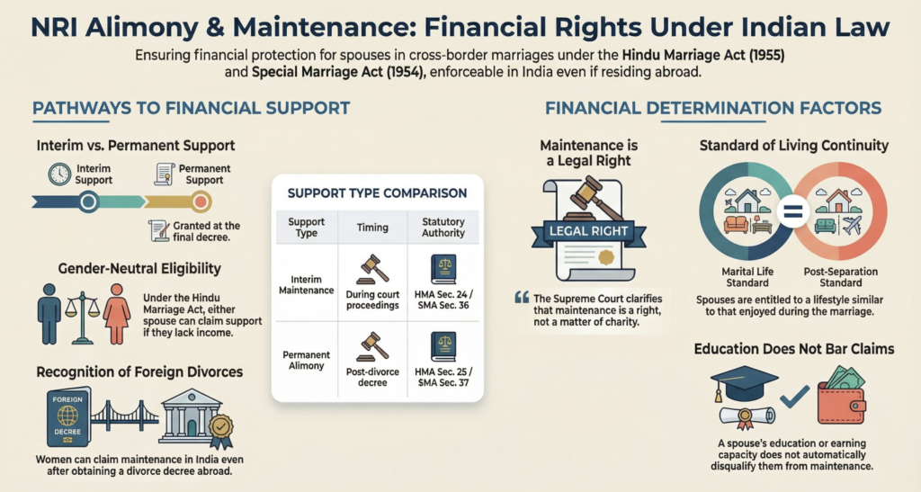 Importantly, Indian courts ensure that legal obligations are not avoided merely because one spouse resides abroad. In cases involving NRIs, courts can pass appropriate orders to secure compliance, ensuring that both husbands and wives fulfill their financial responsibilities, regardless of their location.