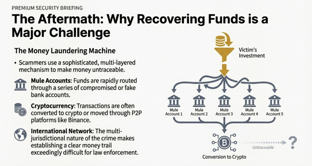 It is Hard to recover the money lost to new age investment scams, as they use multiple mule accounts to route money via series of bank accounts and use multi layer money laundering mechanism to make the money disappear. In many cases, by cybercrime police, its reported that these cyber syndicates often use crypto transactions or P2P payment methods like Binancee. Thus making it hard to establish the money trail and recovering funds becomes difficult.