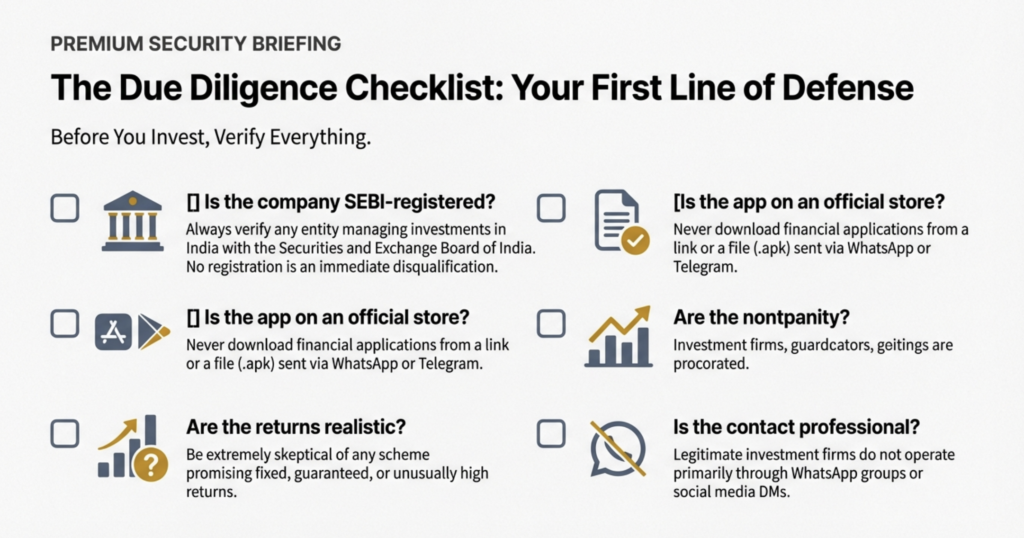1) Always confirm before investing. It is recommended to confirm if the company is SEBI-registered before committing any funds. The legitimate schemes will never promise a fixed or unrealistically high returns on the investment(such as 30% monthly), through informal channels like WhatsApp or social media.