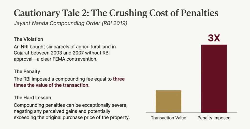 Outcome: In this case the NRI had to sell the land and pay a penalty calculated considering gains and duration of contravention.