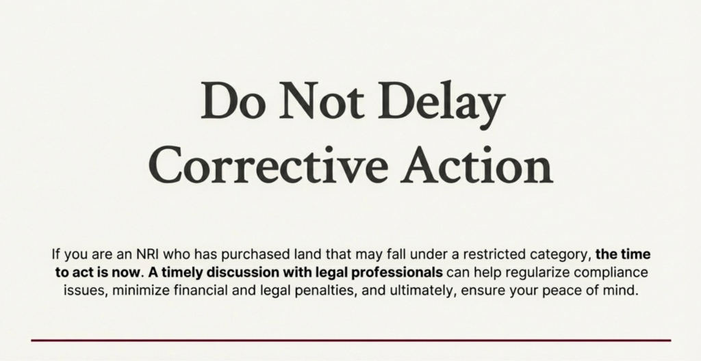If you are an NRI who has already purchased land that may fall under restricted categories, do not delay corrective action. A timely discussion with legal professionals can help regularize issues, minimize penalties, and ensure peace of mind.