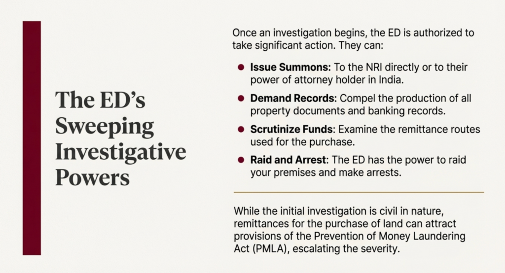 • The ED has various powers during an investigation, including issuing summons to the NRI, demanding banking records and property documents, and examining remittance routes.