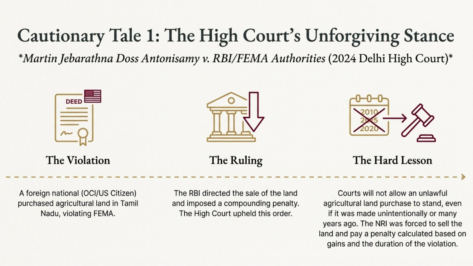 Significance for NRIs: It shows that the courts will not allow unlawful agriculture land purchase to stand even if made unintentionally.