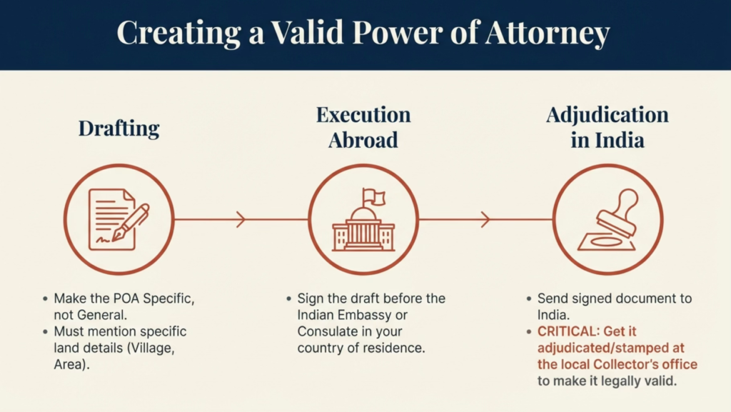 - Draft a precise and specific power of attorney mentioning the specific purpose and property details.