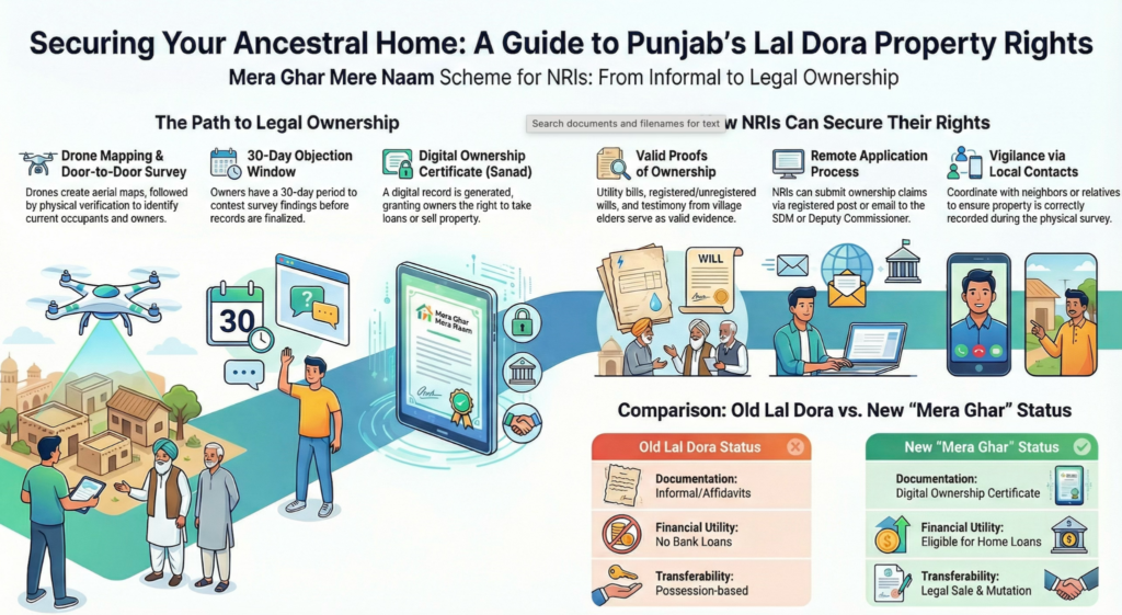 - The NRI should get information on what stage the Lal Lakir property registration scheme (MERA GHAR MERA NAAM) has reached from their neighbors in the village or from other sources.